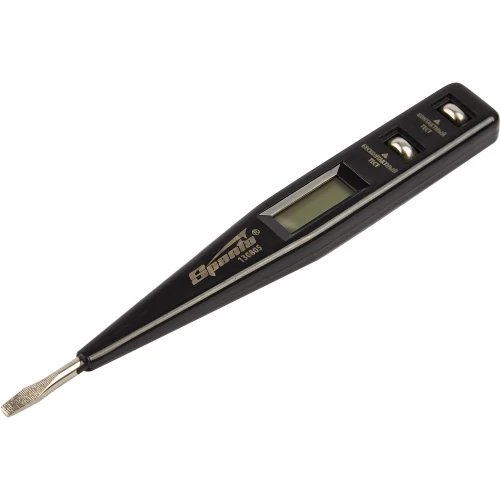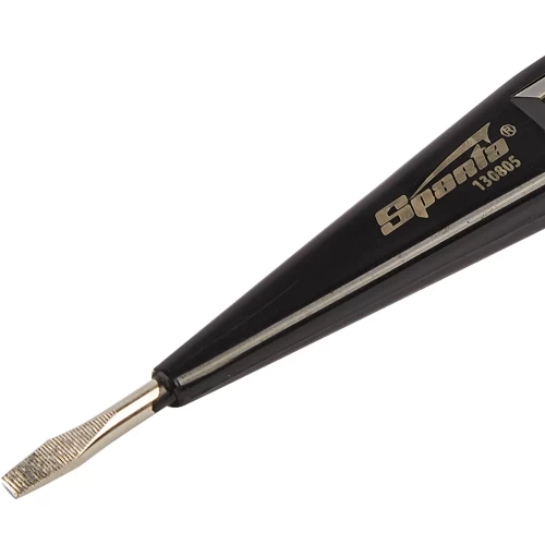 Отвертка индикаторная Sparta SL3 с профилем «прямой шлиц» используется для определения наличия и уровня напряжения в сети переменного тока. Ручка изготовлена из прочного негорючего пластика. Стержень металлический. На корпусе расположено смотровое окно, на которое выводятся измеряемые показатели.