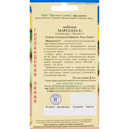 Семена овощей кабачок Марселла F1 — низкорослый раннеспелый гибрид, который хорошо растет как в открытом грунте, так и теплице. Сбор урожая начинают на 38-40 сутки от появления первых всходов. Отличается устойчивостью к болезням и неблагоприятным погодным условиям. Посадку проводят в марте-апреле.