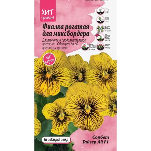 Семена цветов Агросидстрейд фиалка рогатая Сорбет Тайгер Ай F1 используются для высадки в миксбордеры. За счет контрастной окраски желтого с черным цветов получаются оригинальные композиции. Характеризуются длительным и обильным цветением. Период — с апреля по июль. Высота фиалки — до 20 см.