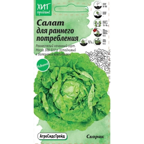 Семена Агросидстрейд салат Скорик — раннеспелый сорт, который достигает 14-15 см в высоту. Высевается в открытый грунт в апреле-июле. При этом рекомендуется соблюдать схему посадки 15 х 18 см. Достигает зрелости в мае-октябре. Полив проводят по мере высыхания почвы.