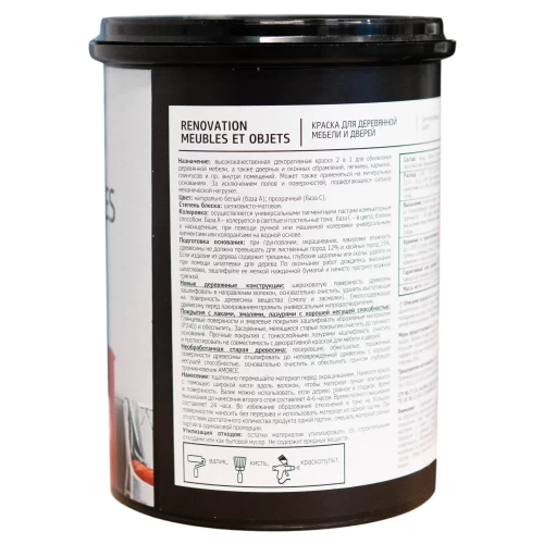 Краска для мебели Maitre Deco Renovation – высококачественная декоративная краска 2 в 1 для обновления деревянной мебели, а также дверных и оконных обрамлений, лепнины, карнизов, плинтусов и пр. внутри помещений. Может также применяться на минеральных основаниях. За исключением полов и поверхностей, подвергающихся сильной механической нагрузке.