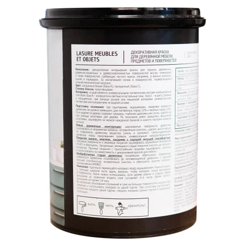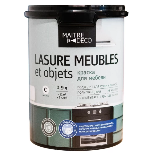 Краска для мебели Maitre Deco Lasure - декоративная интерьерная краска для окраски деревянных, древесностружечных и древесноволокнистых поверхностей внутри помещений, а также поверхностей, требующих частого мытья, например, в ванных комнатах, кухнях и коридорах. За исключением полов и поверхностей, подвергающихся сильной механической нагрузке.
