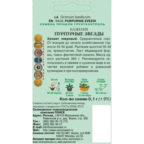 Базилик овощной «Пурпурные звезды» (А) — среднеспелый (зелень срезают через 45-50 дней) сорт, с выраженной антоциановой окраской листьев и лавровым ароматом. Растение низкорослое, до 40 см в высоту, хорошооблиственное. Листья среднего размера, ровные по краю. Используются в свежем и сушеном виде. Подходят в качестве вкусоароматической добавки при консервировании.