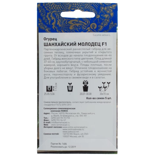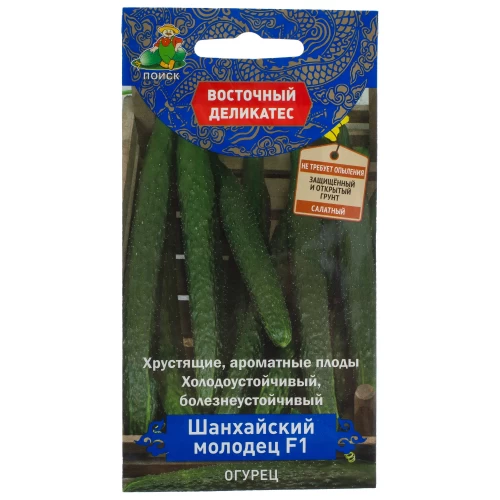 Семена Огурец «Шанхайский молодец» F1 предназначены для посадки в открытый или защищенный грунт (теплицы). Раннеспелый сорт — от всходов до сбора первых плодов проходит 44-46 суток. Не требует опыления. Плоды крупнобугорчатые, с хорошим вкусом, длина — до 40 см. Подходят для употребления в свежем виде или в овощных салатах. Период высадки в открытый грунт — май. Сбор урожая происходит с июля по сентябрь. Сорт устойчив к мучнистой росе и фузариозу.