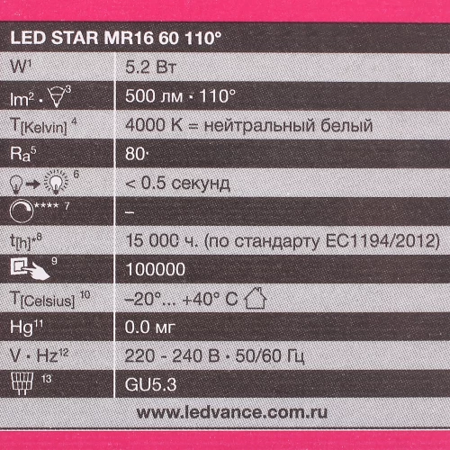 - Потребляемая мощность — 5,2 Вт. Эквивалентна мощности 45 Вт у лампы накаливания.