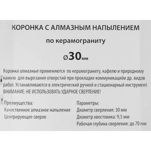 | Состав набора (количество и тип) | коронка алмазная по керамограниту 1 шт |