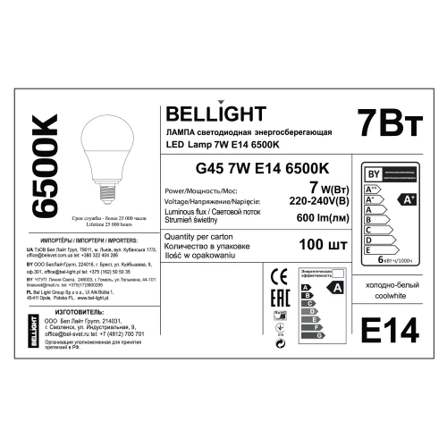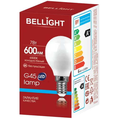 Лампа светодиодная Bellight предназначена для установки в осветительные приборы с цоколем E14. Выполнена в классической форме шара, работает от сети переменного тока 220-240 В. Мощность составляет 7 Вт.