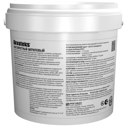 Лак паркетный Akvateks предназначен в качестве финишного покрытия деревянных, паркетных полов в помещениях со средней нагрузкой. Используется как декоративный и защитный материал. Может применяться для обработки вертикальных и горизонтальных поверхностей из дерева и материалов, изготовленных из древесины: фанеры, ДСП, ДВП и т. д. Разрешен к применению в детских и дошкольных учреждениях. После нанесения формирует плотную, матовую и прозрачную пленку, способную защитить дерево от негативного воздействия влаги, солнечных лучей.