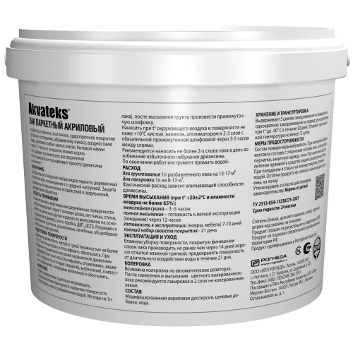 Лак паркетный Akvateks предназначен в качестве финишного покрытия деревянных, паркетных полов в помещениях со средней нагрузкой. Используется как декоративный и защитный материал. Может применяться для обработки вертикальных и горизонтальных поверхностей из дерева и материалов, изготовленных из древесины: фанеры, ДСП, ДВП и т. д. Разрешен к применению в детских и дошкольных учреждениях. После нанесения формирует плотную, полуматовую и прозрачную пленку, способную защитить дерево от негативного воздействия влаги, солнечных лучей.