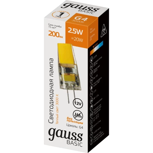 Лампа светодиодная Gauss G4 12 В 2.5 Вт капсула прозрачная 200 лм, теплый белый свет