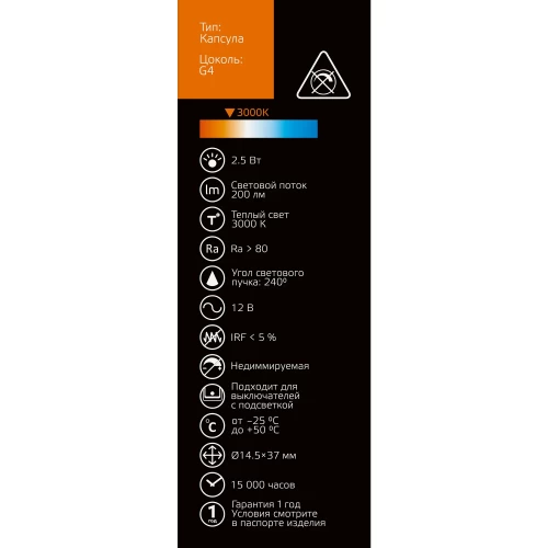 Цветовая температура — 3000 K, цвет освещения — теплый белый (желтый). Отлично подходит для жилых помещений. Одна лампа со световым потоком 180 лм рассчитана на освещение 1,5 м^2^.