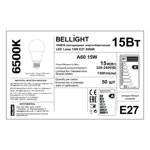Лампа светодиодная Bellight предназначена для установки в осветительные приборы с цоколем E27. Выполнена в классической форме груши, работает от сети переменного тока 220-240 В. Мощность составляет 15 Вт.