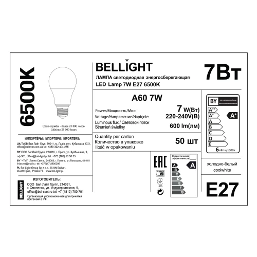 Лампа светодиодная Bellight предназначена для установки в осветительные приборы с цоколем E27. Выполнена в классической форме груши, работает от сети переменного тока 220-240 В. Мощность составляет 7 Вт.