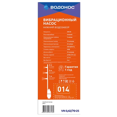 Насос садовый вибрационный Водонос 0.42/70-25, кабель 25 м, 1500 л/час