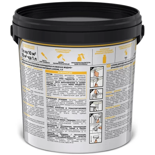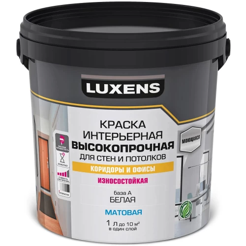 Краска Luxens для стен и потолков в коридорах и офисах предназначена для окраски стен и потолков в помещениях с высокой эксплуатационной нагрузкой, таких как коридоры и офисы. Краска образует покрытие с высокой устойчивостью к истиранию, многократному мытью. Легко наносится на поверхность, не желтеет в процессе эксплуатации. Применяется для окраски всех типов минеральных поверхностей, а также бетонных, оштукатуренных, зашпатлёванных, обшитых гипсокартонными листами, оклеенных обоями под покраску и ранее окрашенных водно-дисперсионными красками поверхностей. Краска образует покрытие с высокой устойчивостью к истиранию, многократному мытью. Легко наносится на поверхность, не желтеет в процессе эксплуатации. «База А» - белая краска, готовая к применению. Возможна колеровка в светлые тона: компьютерная, либо пигментными пастами для водно-дисперсионных красок.