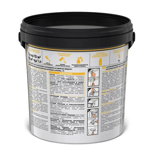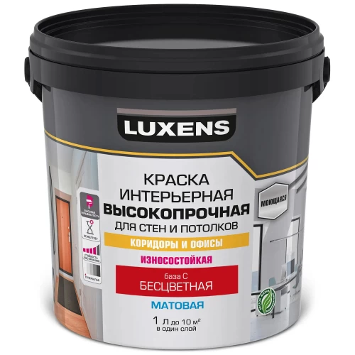 Краска Luxens для стен и потолков в коридорах и офисах предназначена для окраски стен и потолков в помещениях с высокой эксплуатационной нагрузкой, таких как коридоры и офисы. Краска образует покрытие с высокой устойчивостью к истиранию, многократному мытью. Легко наносится на поверхность, не желтеет в процессе эксплуатации. Применяется для окраски всех типов минеральных поверхностей, а также бетонных, оштукатуренных, зашпатлёванных, обшитых гипсокартонными листами, оклеенных обоями под покраску и ранее окрашенных водно-дисперсионными красками поверхностей. Краска образует покрытие с высокой устойчивостью к истиранию, многократному мытью. Легко наносится на поверхность, не желтеет в процессе эксплуатации. «База С» - прозрачная база, готовая к применению только после компьютерной колеровки в яркие насыщенные цвета.