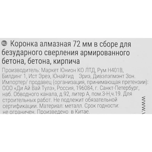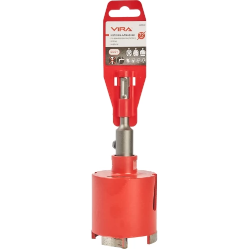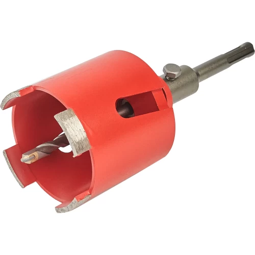 Состав набора (количество и тип) 1 шт. коронка алмазная по бетону 72мм; 1 шт. держатель М16 с хвостовиком SDS-plus; 1 шт. центрирующее сверло М8