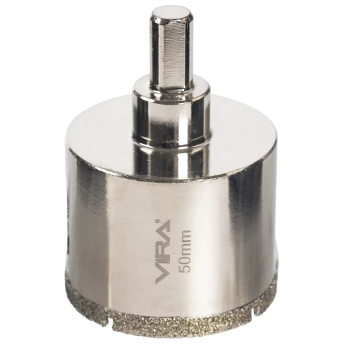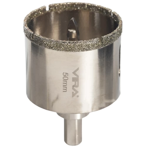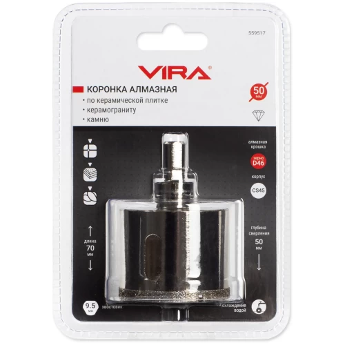 Состав набора (количество и тип) 1 шт. КОРОНКА АЛМАЗ. ПО КЕР.ГРАН. ф50 мм VIRA, 1 шт. центрирующее сверло