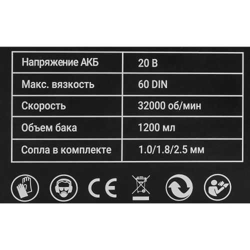 1 шт стакан для измерения вязкости 1 шт игла 5 шт фильтр для краски 1 шт АКБ 1 шт ремень 3 шт сопло 1 шт ключ 1 шт зарядное устройство 1 шт руководство по эксплуатации |