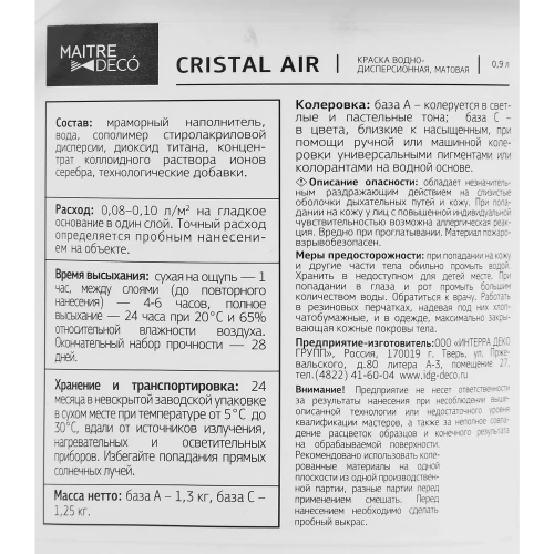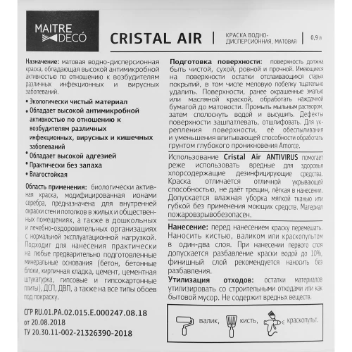 Краска для колеровки для стен Maitre Deco Cristal Air Antivirus - биологически активная краска, модифицированная ионами серебра, предназначена для внутренней окраски стен и потолков в жилых и общественных помещениях, а также в дошкольных и лечебно-оздоровительных организациях с нормальной эксплуатационной нагрузкой. Подходит для нанесения практически на любые предварительно подготовленные минеральные основания (бетон, бетонные блоки, кирпичная кладка, цемент, цементная штукатурка, гипсовые и гипсокартонные плиты), ДСП, ДВП, а также на все типы обоев под покраску.