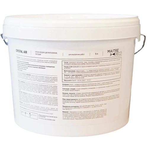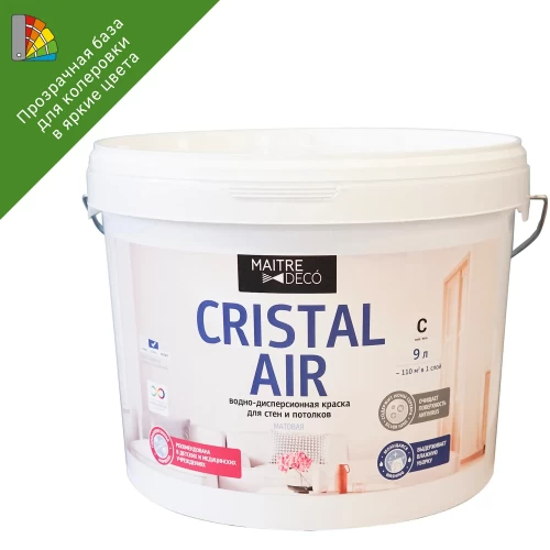 Краска для колеровки для стен Maitre Deco Cristal Air Antivirus - биологически активная краска, модифицированная ионами серебра, предназначена для внутренней окраски стен и потолков в жилых и общественных помещениях, а также в дошкольных и лечебно-оздоровительных организациях с нормальной эксплуатационной нагрузкой. Подходит для нанесения практически на любые предварительно подготовленные минеральные основания (бетон, бетонные блоки, кирпичная кладка, цемент, цементная штукатурка, гипсовые и гипсокартонные плиты), ДСП, ДВП, а также на все типы обоев под покраску.