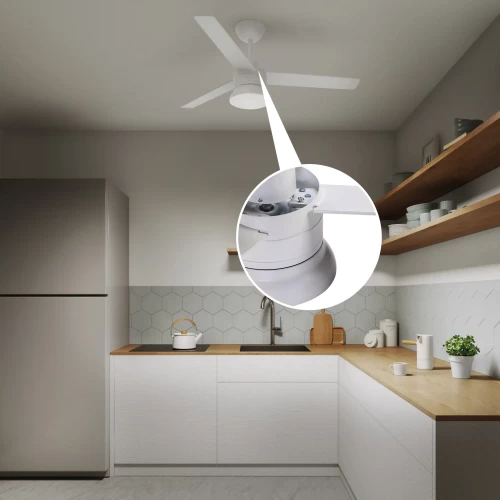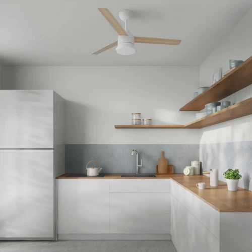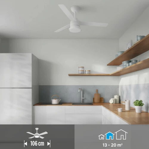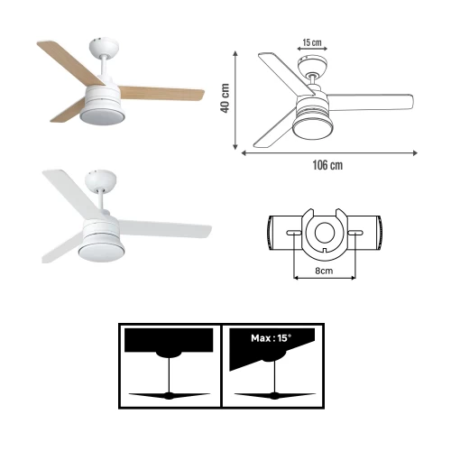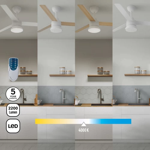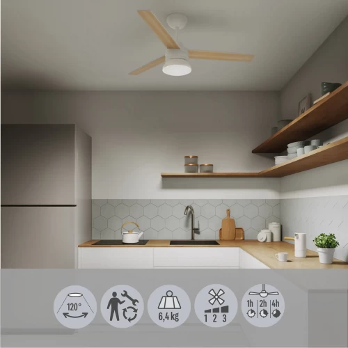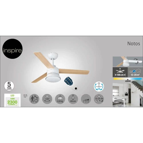 Люстра-вентилятор потолочный лопастной светодиодная Inspire «Notos» с 3 лопастями из дерева FSC идеально подходит для освещения и охлаждения воздуха в помещениях площадью от 13 до 20 м². Благодаря пульту дистанционного управления вы можете регулировать интенсивность вентиляции на 3 скоростях (низкая, средняя, высокая) и запрограммировать желаемое время работы (непрерывно, на 1 час, 2 часа, 4 часа). Notos - это интегрированный светодиодный продукт, который имеет две цветовые температуры 2300LM и 4000K. Вы можете изменить цвет лопастей в зависимости от вашего вкуса и желания: бук сверху и белый снизу. Имеет гарантию 5 лет.