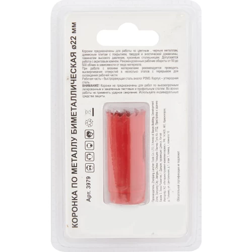 Биметаллическая коронка предназначена для работы по цветным и чёрным металлам, древесине, ламинату, ЛДСП и другим подобным материалам. Диаметр коронки - 22 мм.