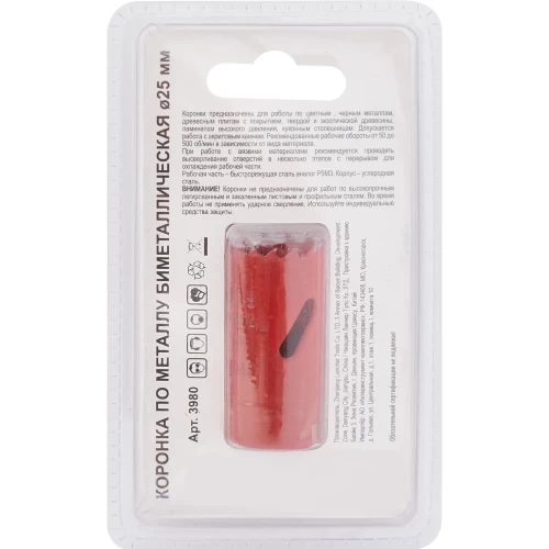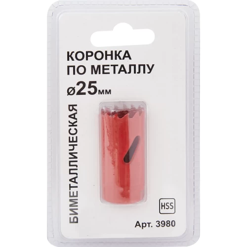 Биметаллические коронки предназначены для сверления сквозных отверстий большого диаметра в тонколистовых металлах, твёрдой древесине, древесных плитах и т.д. Зубья изготовлены из быстрорежущей стали, тело коронки - углеродистая сталь. Диаметр коронки - 25 мм.