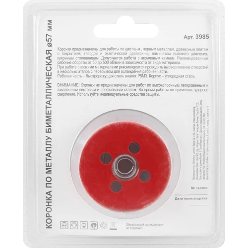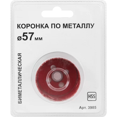 Биметаллическая коронка предназначена для работы по цветным и чёрным металлам, древесине, ламинату, ЛДСП и другим подобным материалам. Диаметр коронки - 57 мм.