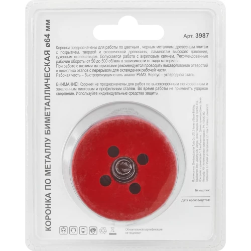 Биметаллическая коронка предназначена для работы по цветным и чёрным металлам, древесине, ламинату, ЛДСП и другим подобным материалам. Диаметр коронки - 64 мм.
