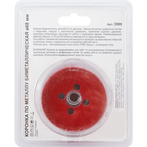 Биметаллическая коронка предназначена для работы по цветным и чёрным металлам, древесине, ламинату, ЛДСП и другим подобным материалам. Диаметр коронки - 68 мм.