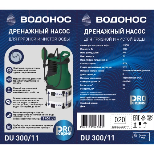 Насос погружной дренажный для чистой воды Водонос DU 300/11 18000 л/ч