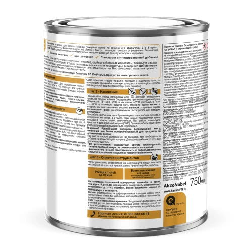 Состав: растворитель, модифицированная алкидная смола, воск, светостойкие пигменты, активные антикоррозионные компоненты, функциональные добавки.