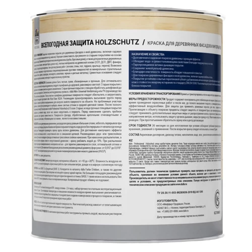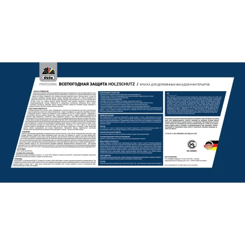 Краска фасадная Dufa Pro Holzschutz - защитное покрытие для деревянных фасадов и иной древесины, включая садовую мебель и полы. Хорошая совместимость при ремонте со старыми покрытиями на основе акрила или алкида. Применяется для покраски массивной древесины, а также для различных деревянных обшивок, плитных материалов на древесной основе. Подходит как для наружных так и для внутренних работ. Возможна также покраска очищенных и подготовленных специализированными грунтами поверхностей из минеральных строительных материалов.