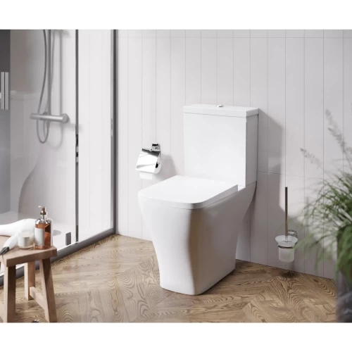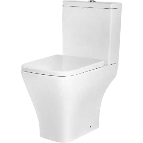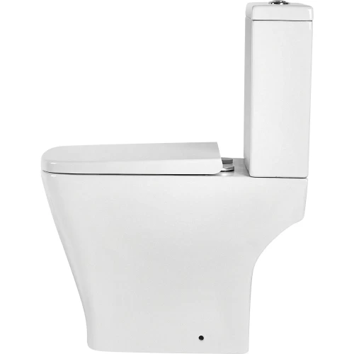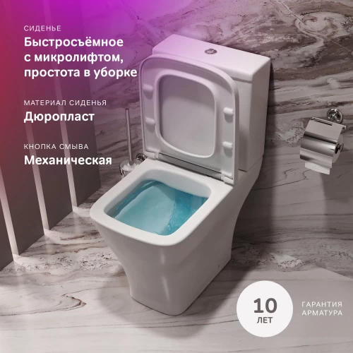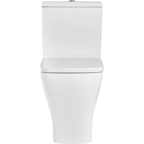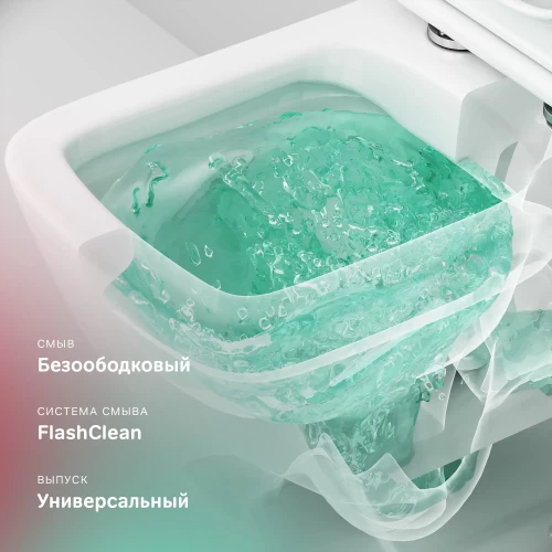 Имеет универсальный укороченный выпуск, благодаря чему есть пространство для подключения любого типа патрубка (прямого, Г-образного, изогнутого). Безободковый унитаз накапливает меньше бактерий, чем обычный. Рассекатель направляет воду из слива не только вниз, но и по бокам чаши, достигая равномерной очистки при малых затратах воды. Изготовлен из керамики, оснащен быстросъемным овальным сиденьем из дюропласта для долговечного использования.
