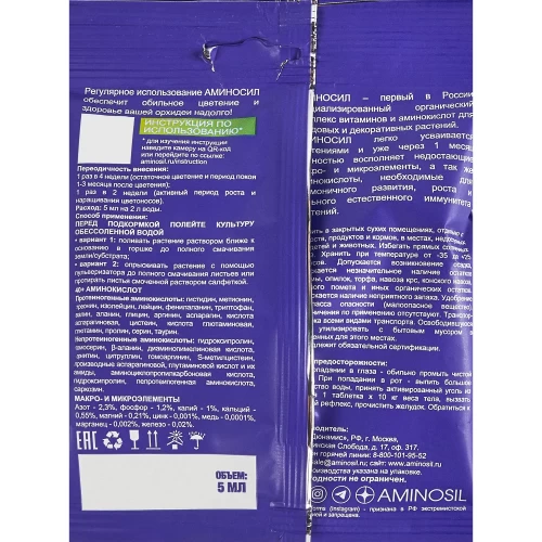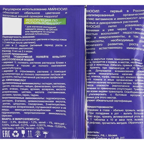 Удобрение Аминосол представляет собой комплексное питание для садовых цветов. За счет легкодоступного соединения минералы и аминокислоты оказывает моментальное действие, укрепляет здоровье растения. Представленного объема хватит для приготовления 2 л жидкого раствора, который используется во время полива и опрыскивания. Состав: гистидин, метионин, треонин, изолейцин, лейцин, фенилаланин, триптофан, валин, аланин, глицин, аргинин, аспарагин, кислота аспарагиновая, цистеин, кислота глютаминовая, глютамин, пролин, серин, таурин, гидроксипролин, гомосерин, β-аланин, диаминопимелиновая кислота, орнитин, цитруллин, гомоаргинин, S-метилцистеин, производные аспарагиновой, глутаминовой кислот и их амиды, аминоциклопропилкарбоновая кислота, гидроксипролин, пепротеипогенная аминокислота, саркозин.