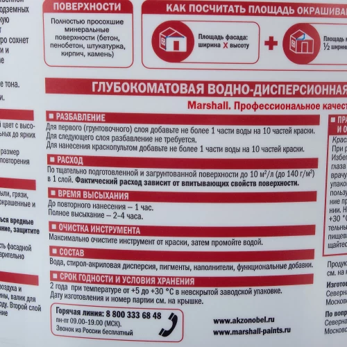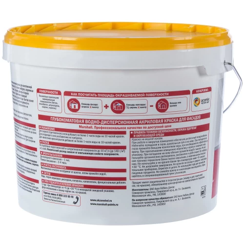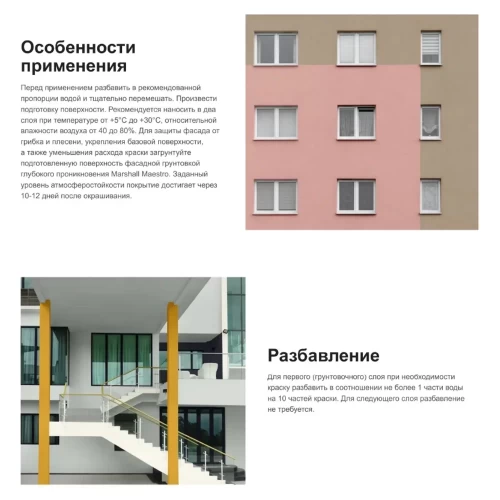 Фасадная краска Marshall Maestro предназначена для окраски фасадов жилых и общественных зданий, подземных гаражей, остекленных балконов, лоджий, тамбуров. Краска без резкого запаха, быстро сохнет. При нанесении образует гладкое высокоукрывистое, атмосферостойкое покрытие, с хорошими грязе- и водоотталкивающими свойствами. Глубокоматовая структура визуально делает поверхность более ровной, позволяя скрыть небольшие дефекты. Срок службы покрытия на фасадных поверхностях до 10 лет (согласно заключению ГБУ Центр «ЭНЛАКОМ» по определению долговечности комплексного покрытия).