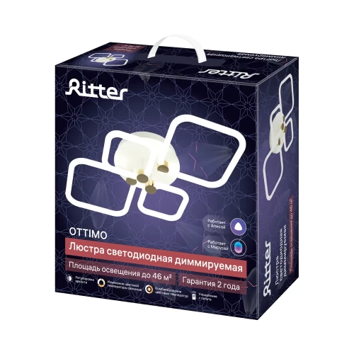 Люстра потолочная светодиодная диммируемая Ritter Ottimo 51616 7 может крепиться к низкому и натяжному потолкам при помощи планки. Выполнена в виде светящихся квадратов. Для управления используются три способа: настенный выключатель, пульт ДУ или голосовой помощник Алиса.