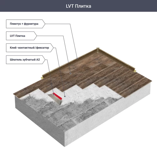 Обратите, внимание на рекомендации по монтажу указанные в инструкции используемого клея. Основание должно быть сухим, чистым, ровным (неровности не более 2мм на 2м). Необходимо наносить тонкий слой клея, используя шпатель A2, обязательно соблюсти время просыхания перед укладкой плитки.