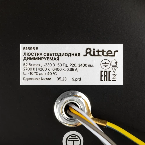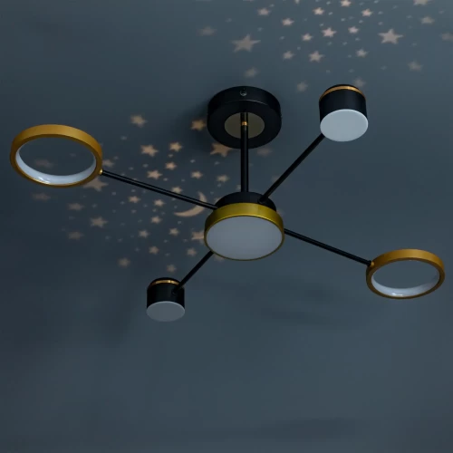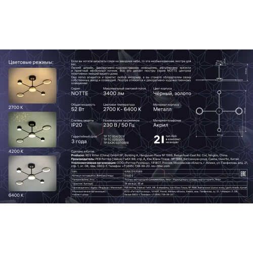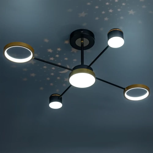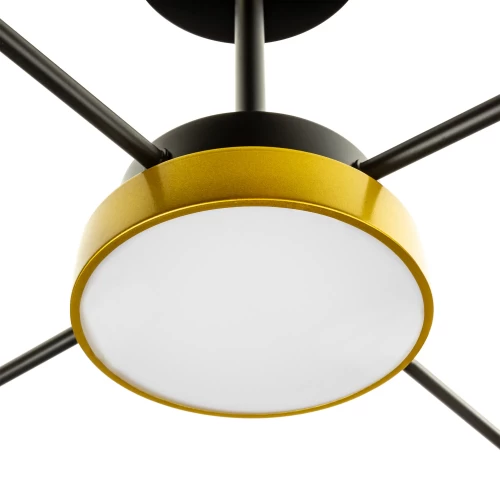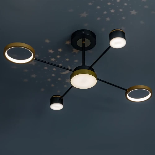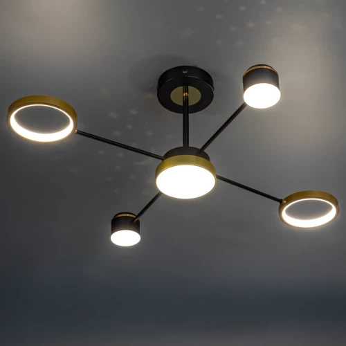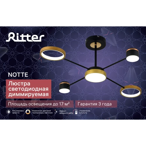 Люстра светодиодная «Note» 515955 черно-золотистого цвета может настраиваться как с помощью настенного выключателя, так и при помощи пульта управления. Он помогает менять цветовую температуру в диапазоне от 2700 до 6400 К, выбирая комфортный вариант. Допускается монтаж к низкому потолку с помощью планки. Люстра используется в помещениях площадью 17 м².