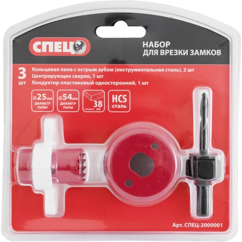 Состав набора (количество и тип) Набор д/врезки замков СПЕЦ по дереву 3предм: пильн кольца диам 25/54мм,центр.сверло, пл.кондуктор
