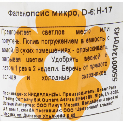 «Фаленопсис микро» — разновидность комнатной орхидеи. Отличается богатой цветовой палитрой и пятнистым узором на лепестках. Растение любит умеренную температуру и хорошее освещение без попадания прямых солнечных лучей. Цветок высаживается в прозрачный стеклянный или пластмассовый горшок с крупными дренажными отверстиями. Для подкормки используются комплексные удобрения, предназначенные для орхидей и эпифитов. Полив выполняется один раз в неделю водой комнатной температуры.