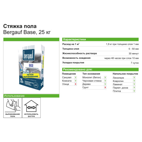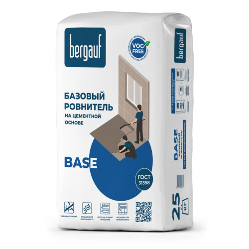 Bergauf Base — сухая смесь на основе песка и цемента с минеральными наполнителями и полимерными добавками. Из нее изготавливают строительный раствор для предварительного ручного выравнивания полов. С помощью ровнителя устраняются серьезные дефекты, например, глубокие сколы и выбоины. В результате использования Bergauf Base получается гладкая, ровная безусадочная поверхность, стойкая к возникновению трещин. Подходит для оснований из монолитного бетона, наливных полов, черновой стяжки и железобетонных плит перекрытия. Можно купить для работы в помещениях с нормальной и повышенной влажностью. Цена указана за упаковку массой 25 кг.