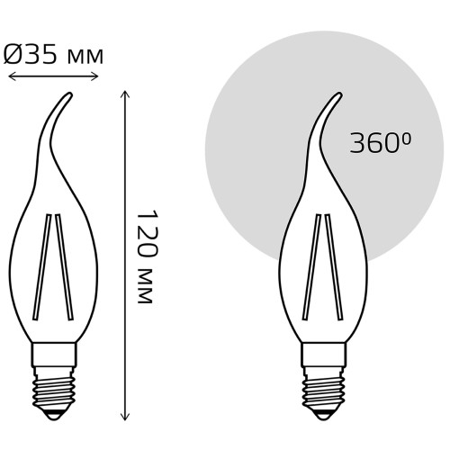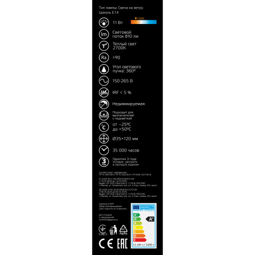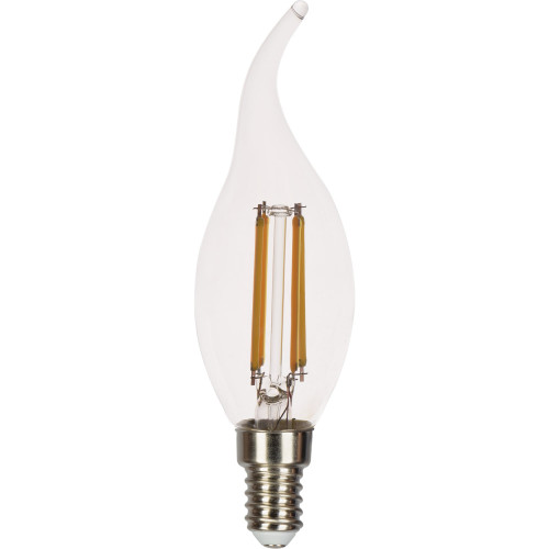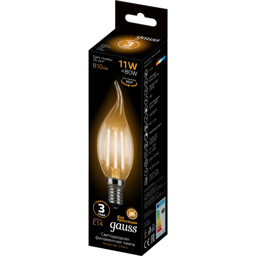 Лампа филаментная Gauss при потребляемой мощности 11 Вт обеспечивает световой поток 720 лм на угол 360°. Теплый свет, который дает лампа, соответствует цветовой температуре 2700 К. Привлекательная форма свечи на ветру с цоколем E14 хорошо смотрится в интерьере. Внешне лампочка похожа на лампу накаливания, но вместо нитей накала внутри располагаются светодиоды, поэтому энергопотребление снижено на 90%. Класс энергоэффективности устройства — A+ (очень высокий). Лампа имеет срок службы 35 000 ч.