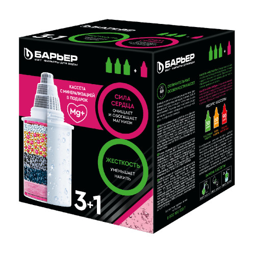 Выгодный комплект из трех кассет БАРЬЕР ""Жесткость"" и одной кассеты "Сила Сердца" позволит надолго избавиться от накипи, а также получить воду, обогащенную незаменимым макроэлементом - магнием.