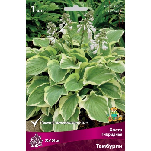 Хоста гибридная «Тамбурин» — декоративный многолетник, образует пышный куст диаметром до 100 см. Листья широкие, глянцевые, зеленого цвета с кремовой каймой. Цветоносы ровные, соцветия состоят из множества воронковидных цветков. Растение морозостойкое, не боится вредителей. Цветет в первой половине лета.