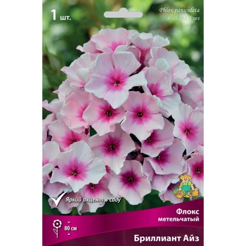 Флокс метельчатый «Бриллиант Айз» — зимостойкое многолетнее травянистое растение с прямым стеблем и остроконечными листьями. Куст развалистый, вырастает до 80 см. Цветки мелкие, колесовидные, душистые, пастельно-розового цвета с более темным центром. Период цветения — с июля по август. Высаживать лучше на хорошо освещенных участках с влажной плодородной почвой.
