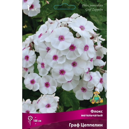 Флокс метельчатый Граф Цеппелин - травянистое многолетнее растение. Стебли прямостоячие, восходящие или ползучие, от 10-20 см до 120-150 см высотой. Листья цельнокрайные, сидячие, расположены супротивно, иногда в верхней части стебля — в очередном порядке, ланцетные, овально-ланцетные, яйцевидно-удлиненные. Цветки душистые, белые, розовые, красные, сиреневые, алые, голубые, карминовые с глазком в центре, 2,5-4 см в диаметре, обычно собраны в щитковидные или метельчатые соцветия различного строения и величины, реже одиночные. Цветение июнь-сентябрь. Граф Цеппелин: высота куста до 110 см. Стебли прямостоячие. Соцветие рыхлое, плоское, сильно разветвленное, размером до 18 см. Цветок крупный, до 4 см, белый с красным глазком. Цветет с 15 - 20 июля, в течение 28 - 30 дней. Устойчив к грибным болезням.