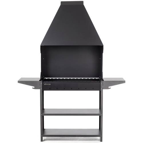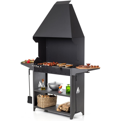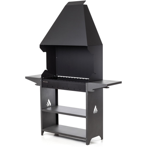 Мангал оснащен полками для хранения дров, посуды и кухонной утвари. Две дополнительные боковые полки сделают процесс приготовления продуктов более удобным. Дополнительные принадлежности для растопки и чистки можно подвешивать на крючки на нижней части полок. Навершие в форме вытяжки обеспечит отвод дыма из зоны приготовления пищи.