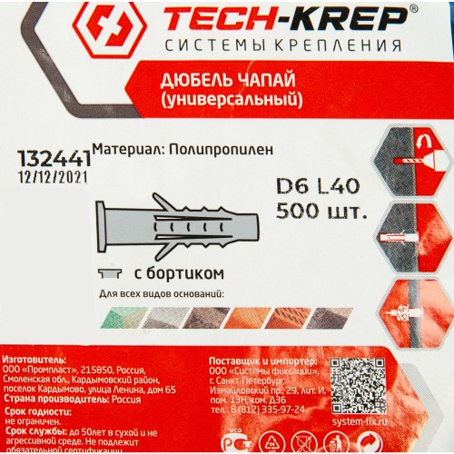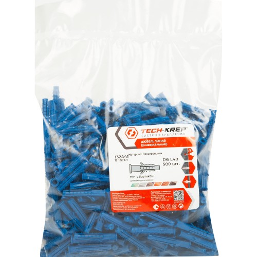 Дюбель распорный для полнотелых материалов Tech-Krep 6x40 мм, полипропилен, 500 шт.
